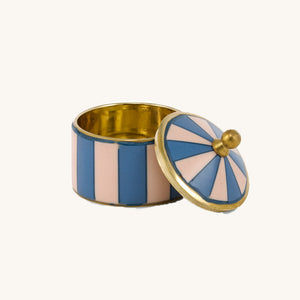 Elevate your room with the Bailey Circus Box Blue, a beautifully handcrafted box that combines playful charm with sophistication. Featuring a delightful blue and pink striped pattern accented with golden...